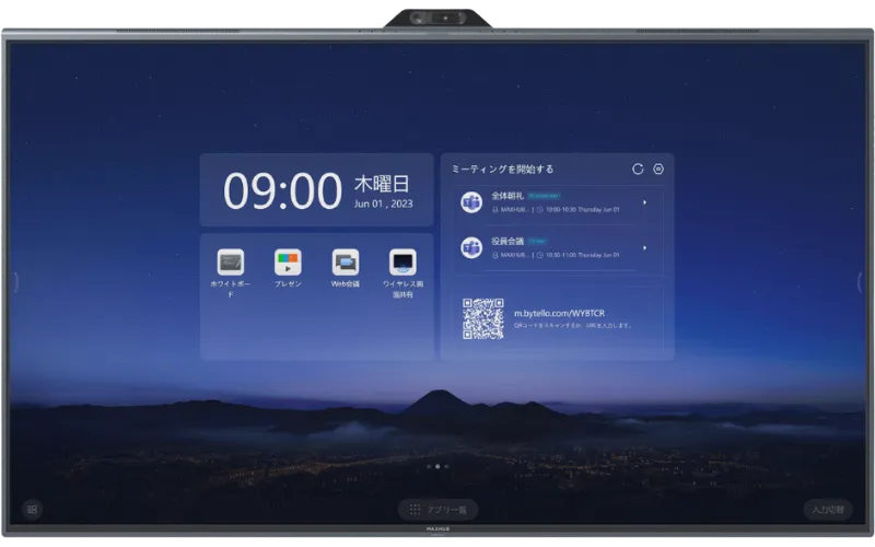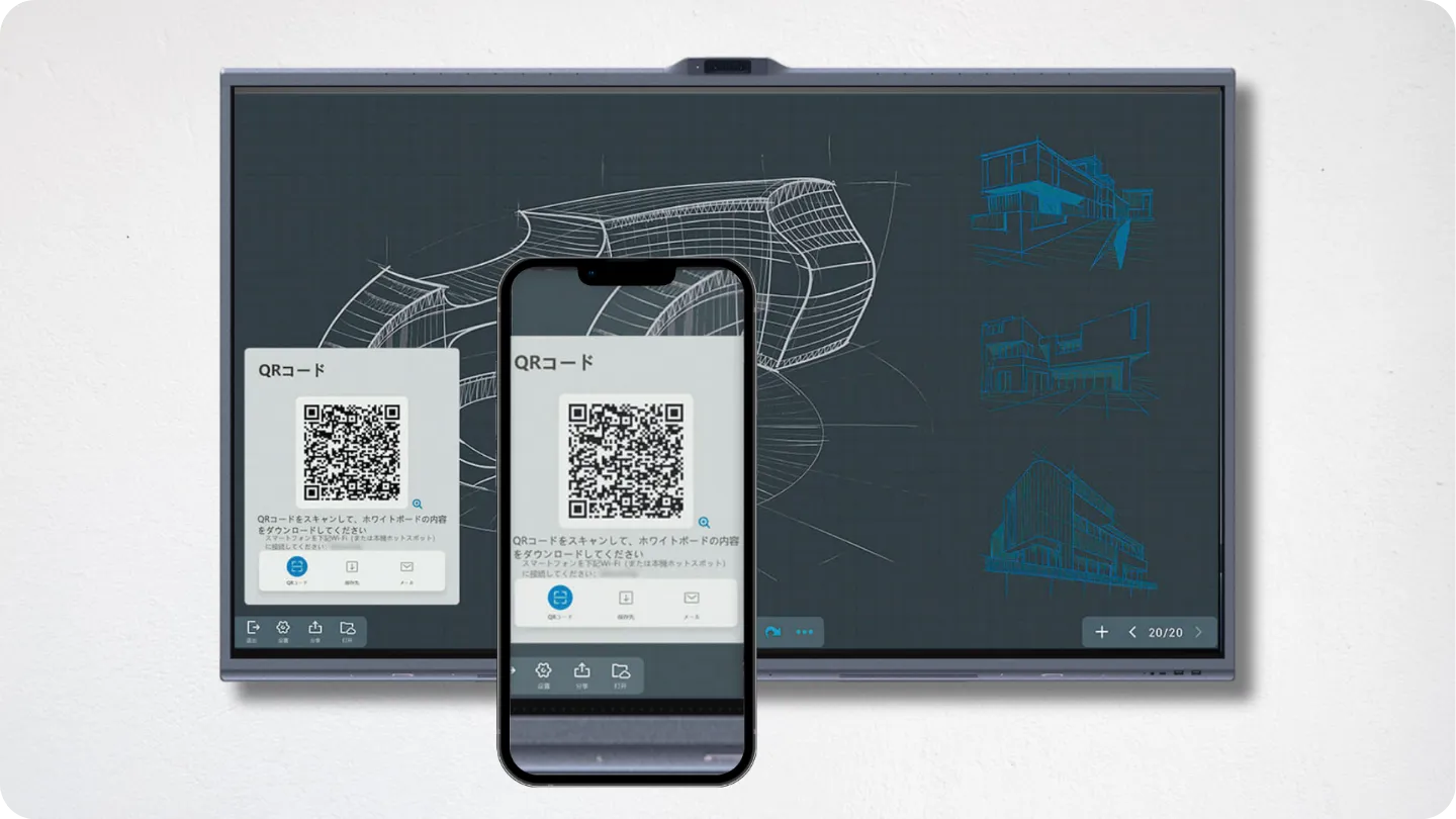 会議後にホワイトボードをスマホで撮影したり、手打ちで議事録を作成したりする作業はもう不要です。 MAXHUBの画面に書き込んだアイデアや決定事項は、ボタン一つでQRコード化。スマホをかざすだけで、PDFや画像データとしてその場で保存・共有できます。「会議が終わった瞬間に、情報共有も終わっている」という圧倒的な時短を実現します。